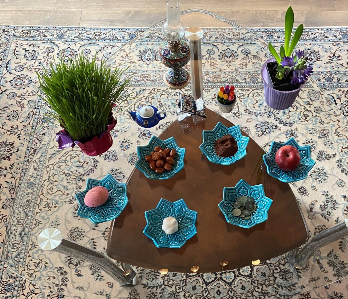 It is almost time for the arrival of the new year and everyone gathers around the “haft-seen.” The haft-seen is a symbolic arrangement of 7 items whose names start with the Persian letter S. These may include the following items: